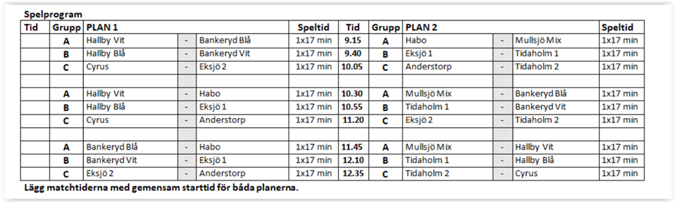 Hej! På söndag samlas vi 9:00 utanför attarpshallen på parkeringen. Vi spelar 2 matcher i Borås. Hemma igen ca 15:30. Ta med handduk mm, vi duschar där. Påminner om att ta med något att äta under dagen till era barn. Glöm ej den vita tröjan och blå matchdräkt. Hälsningar ledarna P15 (födda 2010) 21 okt 2022 1kommentar